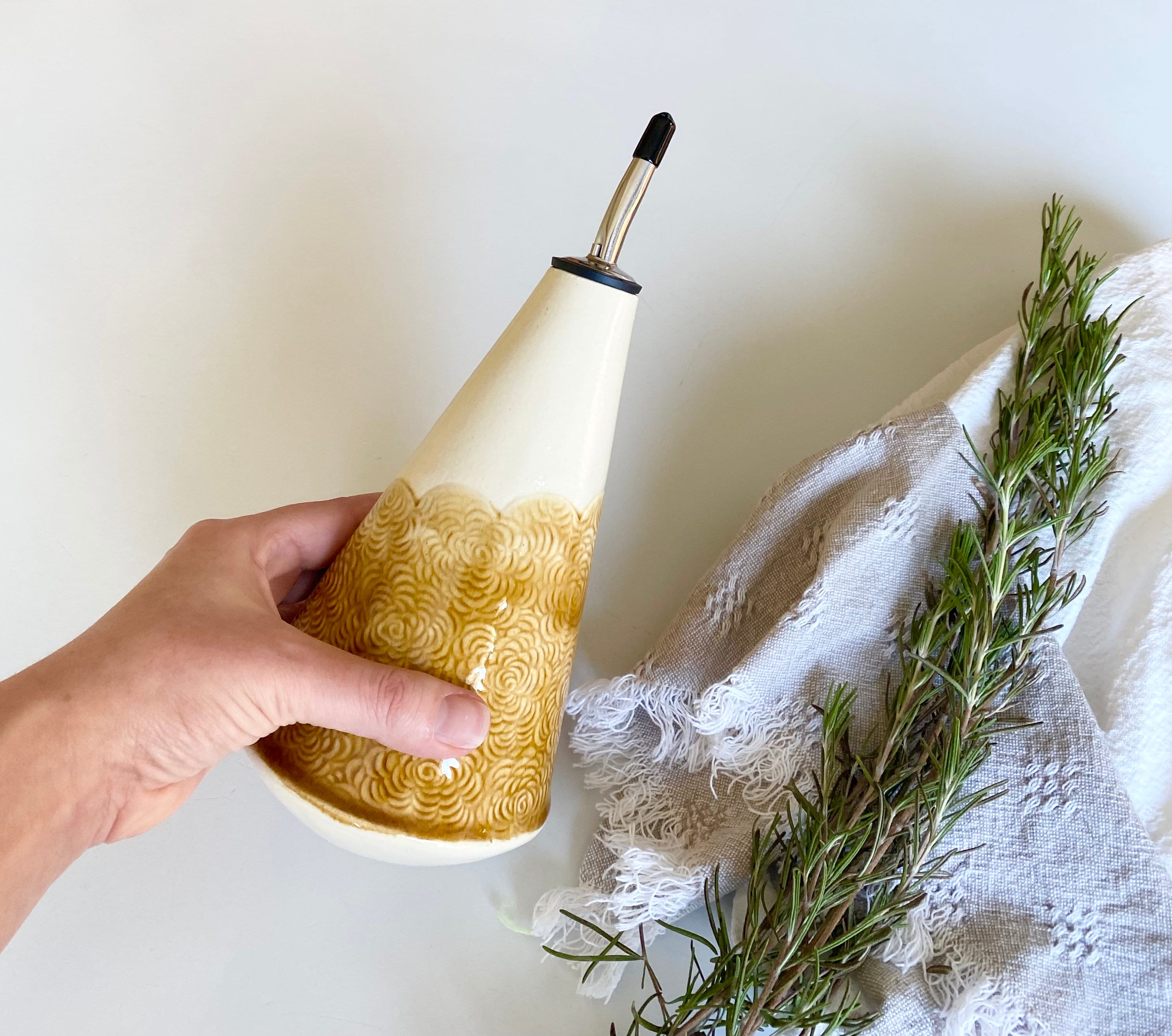 This handcrafted olive oil dispenser is great for any kitchen. Picture this beautiful cruet on your counter next to your stove within easy reach for cooking. This stoneware pourer is great for olive oil, syrup or other cooking oils and makes for a great housewarming or gift for the cook in your life.